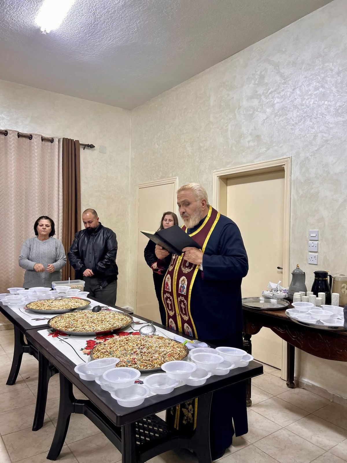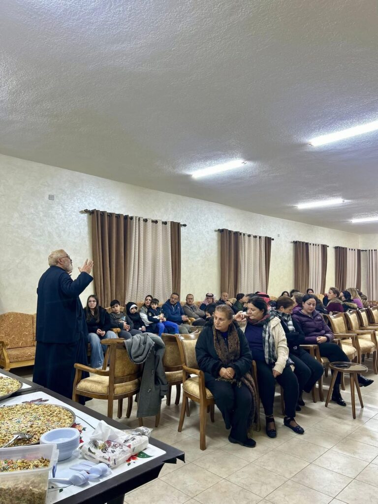 بعد الخدمه مباشره التقى الجميع في القاعه الصغرى حيث تحدث الأب فادي بكلمات روحية حول صوم الميلاد وانتظار المجيء والشهداء واهميتهم في الكنيسة ، كما تطرق الكلام باختصار عن القديس يوحنا الدمشقي وعن القديسة بربارة ، ثم احتفل الجميع بمحبة غامرة بتناول طبق القمح المسلوق الذي اعدته سيدات أخوية القديس جيورجيوس .