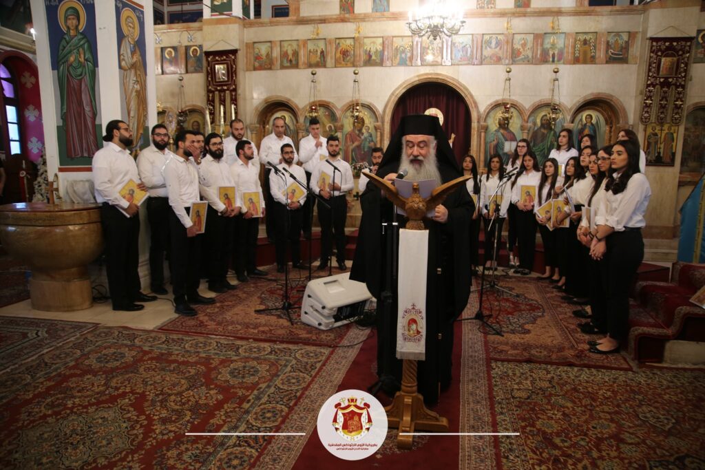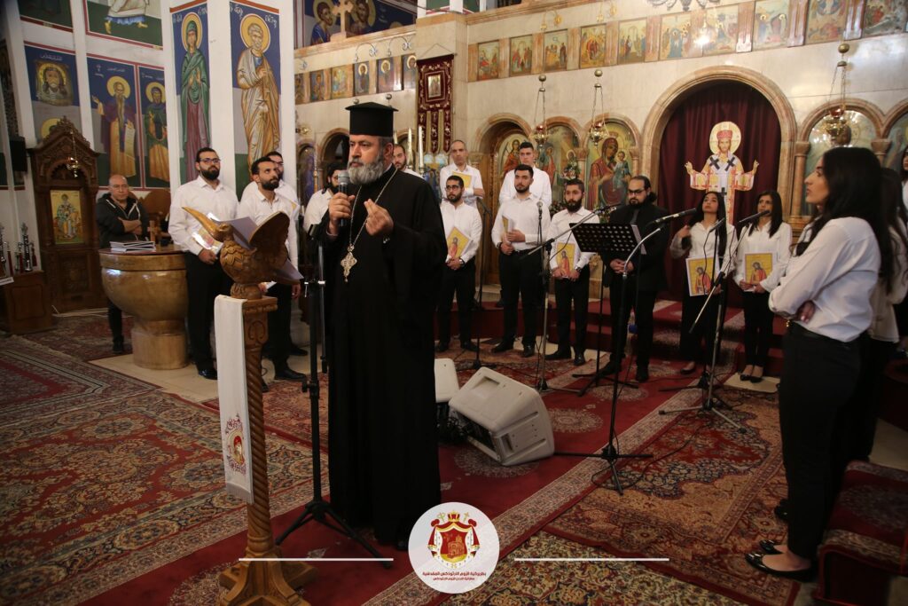 في ختامِ الأمسيةِ تقدَّمَ سيادَتُهُ بالشّكرِ الجزيلِ للأبِ ألكسندروس والأستاذ شكري على جهودِهما مُثمِّنًا أعمالَ قسمِ الفنِّ الكَنَسيّ بكلِّ أقسامِهِ. كما توجَّهَ لأعضاءِ الجوقةِ مؤكِّدًا لهم أنَّ وجودَهُم ضمنَ هذه الأنشطةِ إنّما بترتيبٍ إلهيّ، فلكلِّ واحدٍ منكُم دعوةٌ ورسالةٌ معيَّنَةٌ من السّماءِ لتمجيدِ اسمِ الرّبِّ، ما يُلقي علينا جميعًا مسؤوليَّةً روحيَّةً ألا وهي المحافَظَةُ على إرثِ التّرتيلِ الرّوميّ وتقليدِنا الكَنَسيِّ الشّريفِ من أجلِ إحياءِ ليتورجيّةِ كنيسَتِنا الرّوميَّةِ المقدسيَّةِ “أمّ الكنائس”.
