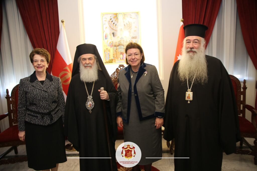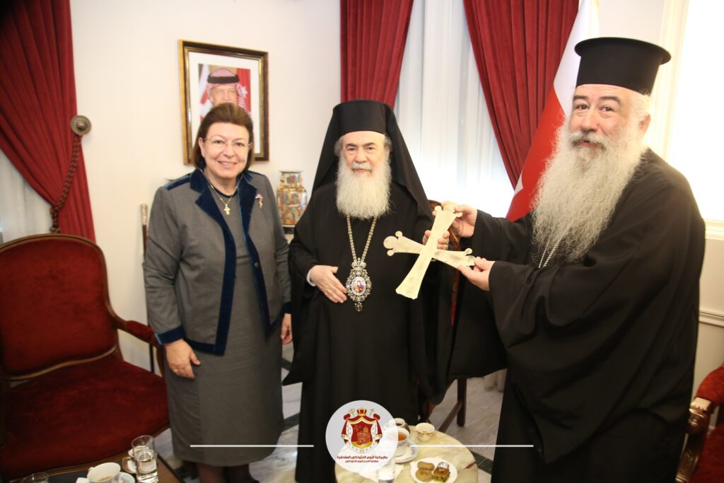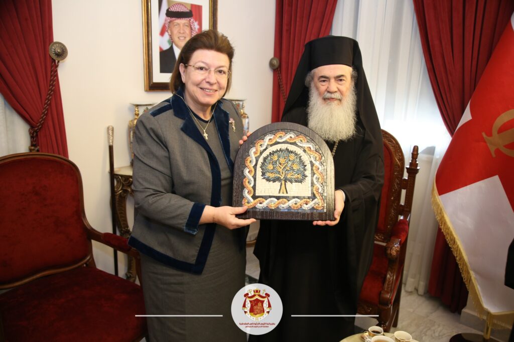 مطرانية الروم الأرثوذكس / المركز الإعلامي عمان 9 كانون الأول 2022 خلال زيارة أبينا صاحب الغبطة بطريرك المدينة المقدسة كيريوس كيريوس ثيوفيلوس الثالث ومشاركته فعالية إطلاق المخطط الهيكلي الشامل لتطوير المنطقة المجاورة لموقع عمّاد السيد المسيح – المغطس، بهدف تعزيز الخدمات المقدمة للزوار والحجاج القادمين إلى المغطس. ألتقى غبطته بوزيرة الثقافة والرياضة اليونانية د. لينة منذوني في دار المطرانية بالعاصمة عمان، بحضور صاحب السيادة المطران خريستوفوروس وسفيرة اليونان في الأردن السيدة إليفيثريا غلاثينياكي وعدد من الاباء الكهنة، خلال اللقاء تباحثا بالأعمال الثنائية والعلاقات المشتركة ما بين الكنيسةِ الأُرثوذكسيَّة المقدسية الوطنيَّة في الأردن والدولة اليونانية وأبرز المجلات للتعاون في المستقبل. في ختام اللقاء تبادلا الهدايا عربون محبة. كما وقام صاحب الغبطة بالمباركة لقدس الارشمندريت سلوان حنونة لتسلمه مهامهِ الرعائية رئيساً روحياً لمحافظة عجلون وقدس الارشمندريت أندراوس شاميَّة لتسلمهِ مهامهِ الرعائية كرئيس روحيّ لمحافظة العقبة متمنياً لهم خدمة مباركة ومُثمرة في سبيل خلاص نفوسِ أبناء الرعيَّة وخدمة أبناء الوطن في ظلِّ حضرة صاحب الجلالة الهاشمية الملك عبدالله الثاني إبن الحسين المعظم الحامي والوصي الأمين على مقدساتِنا المسيحيَّة والإسلاميَّة.