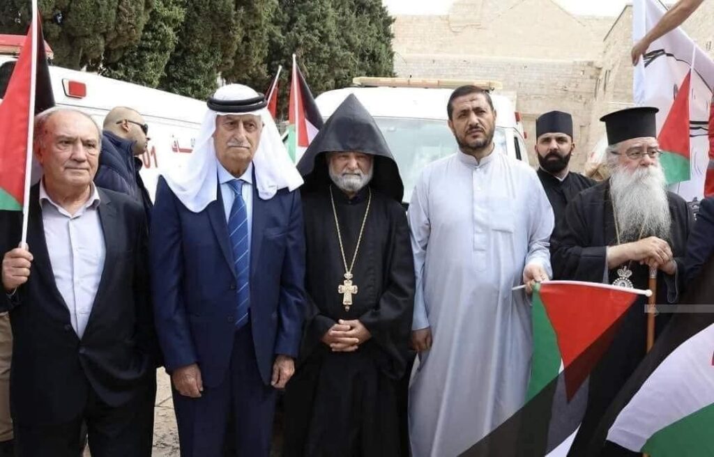 مطرانيَّةُ الرّومِ الأُرثوذكس / المركزُ الإعلاميّ بيت لحم ، الأربعاء 18 تشرين الأوّل 2023 صورٌ من بيت لحم اليومَ تُظهِر المتروبوليت فينيذكتوس مطرانَ بيت لحم ورئيسَ ديرِ الظّهورِ الإلهيّ البطريركيّ – المغطس في وقفةِ احتجاجٍ سِلميّةٍ ضدَّ الحربِ والجرائمِ ضدَّ الشّعبِ الفلسطينيّ وأهلِ غزّة .
