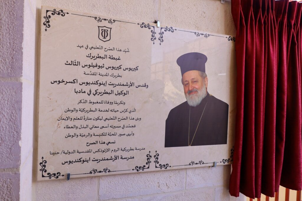 ثم أعلنَ سيادتُه قرارَ المجمعِ المقدّسِ تغييرَ إسم المدرسةِ في مادبا إلى مدرسة بطريركيّة الرّومِ الأرثوذكس المقدسيّة الدّوليّة / حنينا – مدرسة الأرشمندريت إينوكينديوس عربونَ شكر وعرفانٍ على جهودِه وخدمتِه للكنيسة والرّعيّة .
