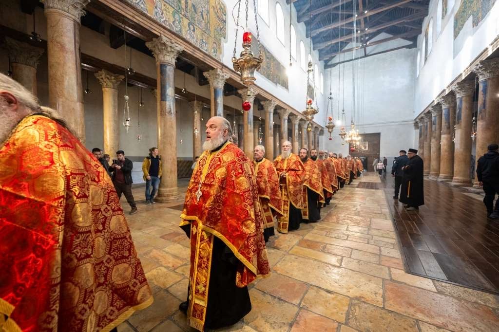 من القاعة الملوكية في الكنيسة عبر غبطة البطريرك مع الاساقفة والكهنة وتوجهوا يمينا من ناحية الايقونسطاس حيث كنيسة القديس نيقولاوس الى مغارة الولادة الموضع الذي ولد فيه المخلص يسوع المسيح, وتم السجود والصلاة من قبل البطريرك والاساقفه والكهنة. بعد ذلك بدأت صلاة الساعات وصلاة الغروب الكبرى ثم القداس الإلهي للقديس باسيليوس الكبير ترأسها غبطة البطريرك يشاركه الأساقفة والآباء. هذه الصلوات حسب الوضع الراهن المعمول به تنتهي عند الساعة 3:30 ظهراً.
