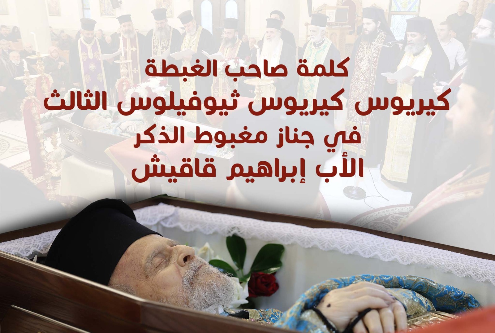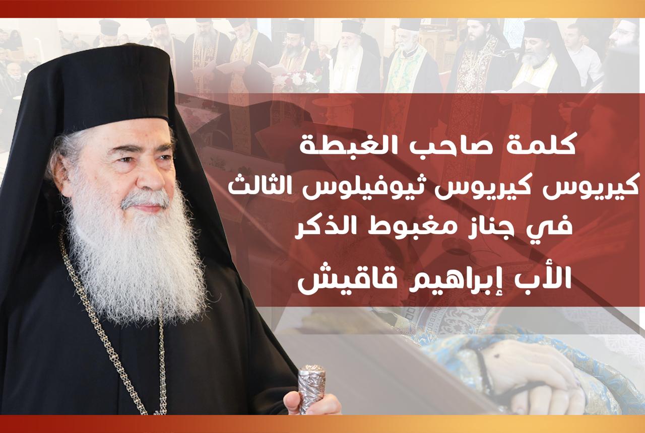 بِرَحْمَةِ اللَّهِ،كَلِمَةُ أَبِينَا صَاحِبِ الْغِبْطَةِ كِيرِيُوس كِيرِيُوس ثِيُوفِيلُوس الثَّالِث بَطْرِيَرْكِ الْمَدِينَةِ الْمُقَدَّسَةِ وَسَائِرِ أَعْمَالِ فِلَسْطِينَ وَالْأُرْدُنِّ الْجَزِيلِ الِاحْتِرَامِ فِي رُقَادِ الْمُطَوَّبِ الذِّكْرِ، الشَّيْخِ الْجَلِيلِ قُدْسِ الإِيكُونُومُس إِبْرَاهِيمَ قَاقِيش رَاعِي كَنِيسَةِ الصُّعُودِ الْإِلٰهِيِّ – خَلْدَاصَاحِبِ السِّيَادَةِ رَئِيسِ أَسَاقِفَةِ كْرِيَاكُوبُولِيس وَمِطْرَانِ الْأُرْدُنِّ خْرِيسْتُوفُورُوس الْجَزِيلِ الِاحْتِرَامِ،عَائِلَةِ الْمُغْبُوطِ الذِّكْرِ الإِيكُونُومُس إِبْرَاهِيمَ قَاقِيش، الْمَحْبُوبِينَ بِالرَّبِّ،عُمُومِ عَشِيرَةِ قَاقِيش وَأَنْسَابِهِمْ وَأَقَارِبِهِمْ فِي الْأُرْدُنِّ وَالْمَهْجَرِ الْكِرَامِ،الْأَبْنَاءِ الْأَحِبَّاءِ: الْإِكْلِيرُوسِ الْمُوَقَّرِ، وَشَعْبِنَا المؤمنِ،