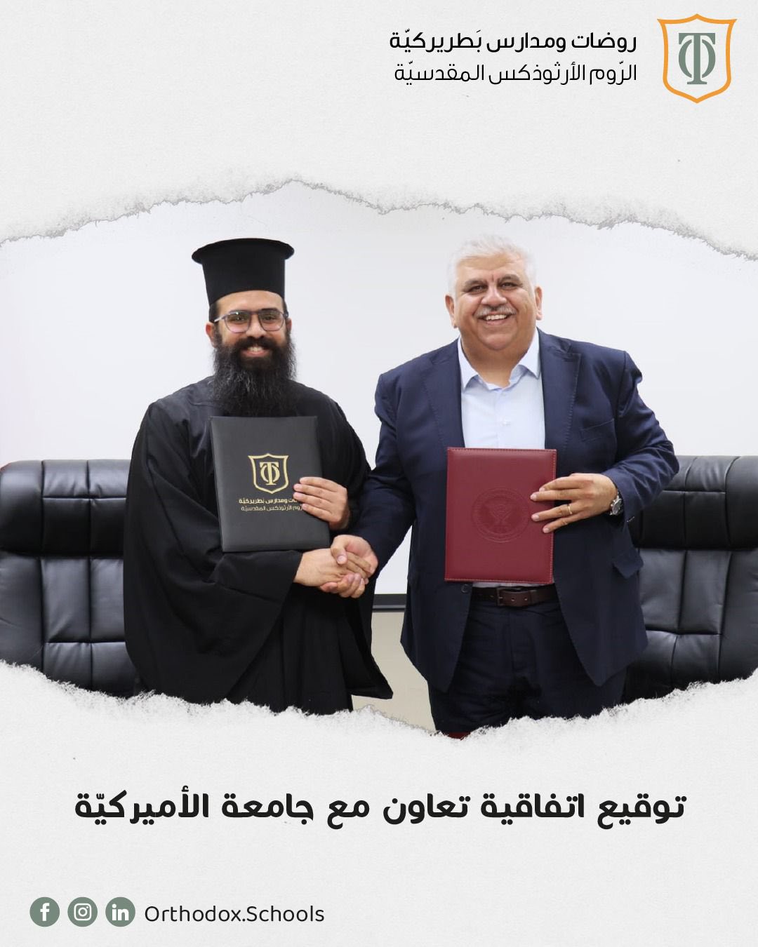 في خطوة تهدف إلى تعزيز التّعاون الأكاديمي وبناء الشّراكات وتمكين الطلاب، جددت روضات ومدارس بطريركية الروم الأرثوذكس المقدسية (GOPS) و الجامعة الأمريكية في مادبا (AUM) اليوم مذكرة التفاهم بينهما. حيث وقع الاتفاقية عن الجامعة البروفيسور مأمون عكروش، وعن مجموعة الروضات والمدارس قدس الأب اغناطيوس خليفة المدير العام.