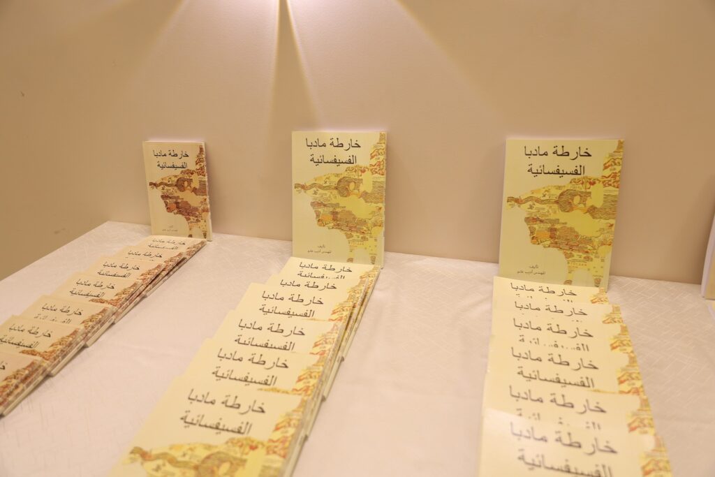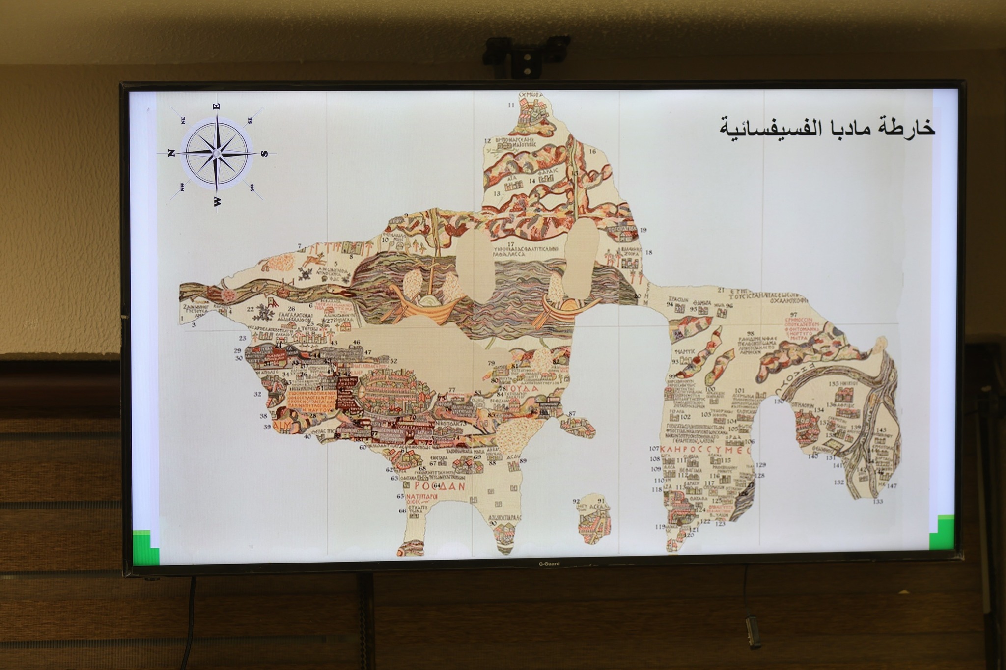 كما أوضح أهمّيّتَها كتراثٍ وإرثٍ حضاريٍّ ومرجعًا توثيقيًّا يؤكّد حقيقة المسيحيّة وجذورَها الرّاسخة في الأردنّ وفلسطين . حيث قدم عرضًا معمّقًا وبحثًا علميًّا يوثّق أهمّيّةَ هذه الخارطة وفرادتَها. وشكر الأبُ جيراسيموس المهندسَ أديب غانم باسم سيادتِه على هذا العمل الكبير مبيّنًا أن سيادتَه يولي كنيسةَ الخارطة في مأدبا اهتمامًا كبيرًا للحفاظ عليها من خلال أعمالِ التّرميم التي انتهت مؤخَّرًا في الكنيسة ، مؤكِّدًا على أهمّيّةِ مثلِ هذه الدّراساتِ المتخصّصة لعرض ونشرِ التّراث والمورثِ المسيحيّ في الأردنّ.