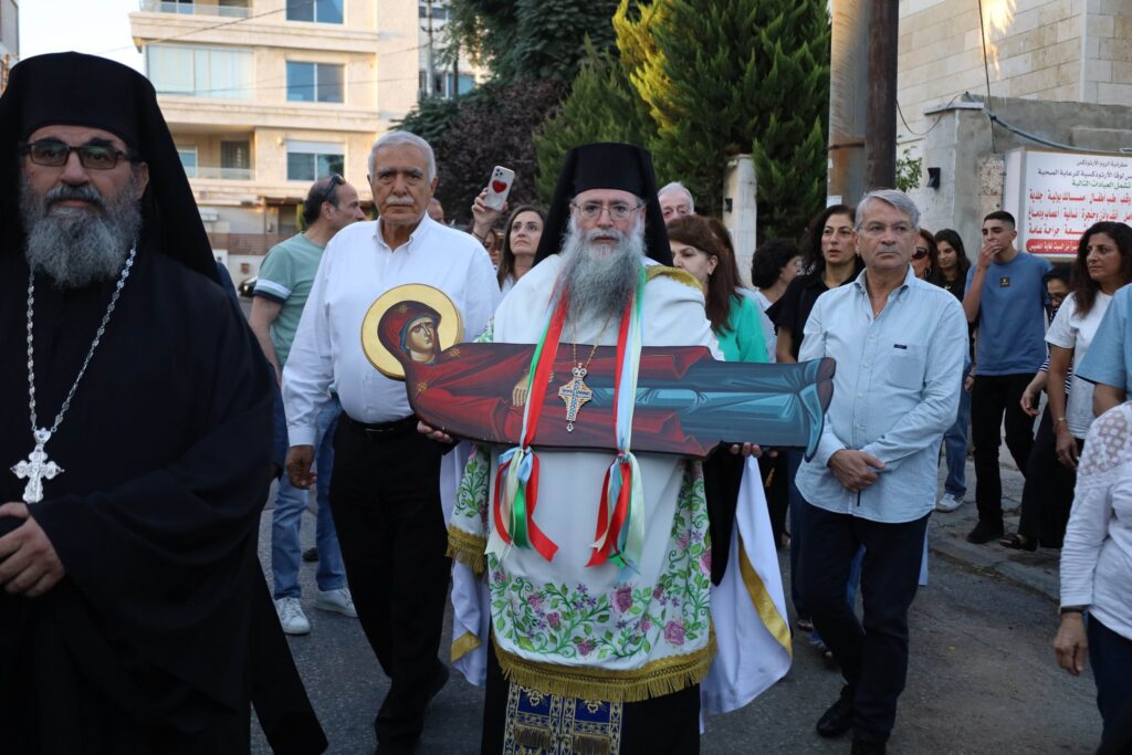 بموكبٍ مهيبٍ تقدّمَ لفيفٌ من الكهنةِ لتطوافِ أيقونةِ الكُلّيَةِ القداسةِ محمولةً على أكفٍّ كهنوتيّةٍ مقدّسةٍ ، من ديرِ القدّيسِ نكتاريوس إلى كاتدرائيّةِ دخولِ السّيّدِ إلى الهيكل ، حيثُ ترأّسَ سيادةُ المطران خريستوفوروس خدمَةَ الابتهالِ لوالدةِ الإلهِ ( البراكليسي ) وتقاريظَ رقادِها ، بمعاونةِ الكهنةِ والشّمامسةِ بحضورِ أبناءِ الرّعيّة ، حيث تناوبَ الجوقانِ على ترتيل تقاريظِ جنّازِ رقادِ والدةِ الإلهِ الكلّيّةِ القداسة بكلِّ خشوع .