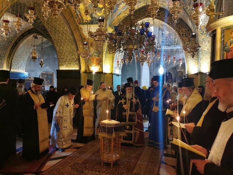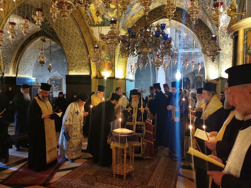 أقيمَتْ في موضِع الجلجلةِ المقَدَّسِ داخِلَ كنيسةِ القِيامةِ صباحَ الإثنينِ خدمةُ القُدّاس الإلهيّ لراحَةِ نفسِ المُثَلَّثِ الرَّحَماتِ رئيسِ أساقِفَةِ نهرِ الأردُنِّ المطران ثيوفيلاكتوس الوكيل البطريركيّ في بيتِ لحمَ ترأّسَها سيادَةُ رئيسُ أساقِفَةِ قسطنطيني أريستَرخوس.