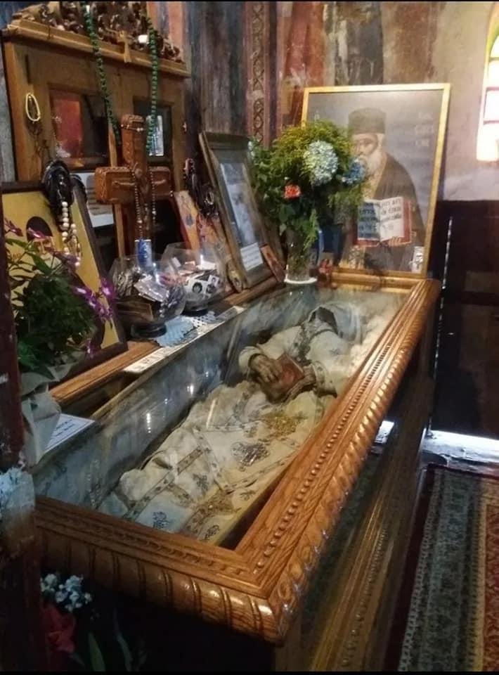 لمَعَ وجهُهُ داخلَ التّابوتِ ورائحةٌ عَطِرَهٌ كانت تخرجُ من جَسَدِهِ. لم يتمكّنوا من دفنِه في المقبرةِ بسببِ الظّروفِ الجوّيّة ، فدفنوه في المكانِ المُخصَّصِ للمعموديّة ، إذ كانت هناك غرَفق مخصَّصَةٌ للاعتراف. الكثيرون استمرّوا بزيارةِ قبرِهِ لسنواتِ مظهرينَ تقواهُم. في الواقِعِ قدَّمَ له الكثيرون التّقدِمات ، كما لو كانوا يقدّمونَها لقدّيس ، دونَ انتظارِ أيَّةِ اشارةِ لإثباتِ قداستِه. وهناك تقاريرُ عن عجائِبَ رائعَة حدثَت عندَ قبرِ الشّيخ.