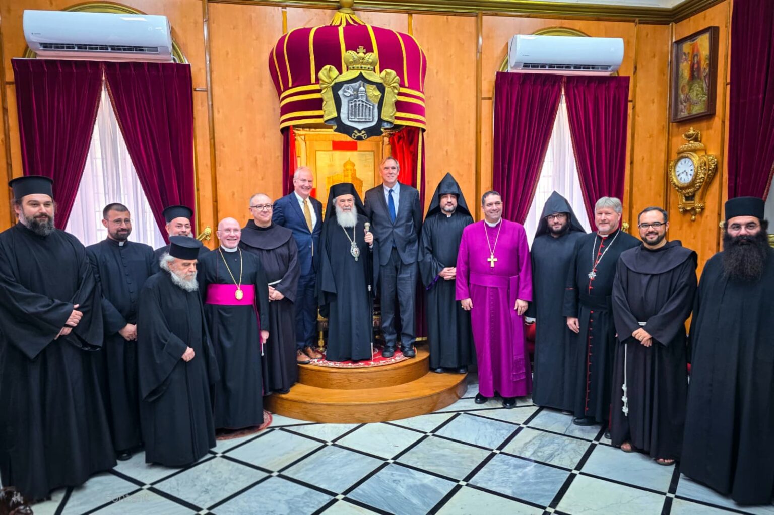 استقبل غبطة البطريرك ثيوفيلوس الثالث، بطريرك القدس وسائر أعمال فلسطين والأردن، في دار البطريركية الأرثوذكسية، وبمشاركة قيادات كَنَسية أرمنية وفرانسيسكانية ولاتينية وانجيلية، عضوي مجلس الشيوخ الأمريكي السيناتور كريس فان هولن والسيناتور جيف ميركلي، في لقاء خُصِّص لمناقشة التحديات الخطيرة التي يواجهها المسيحيون في الأرض المقدسة.