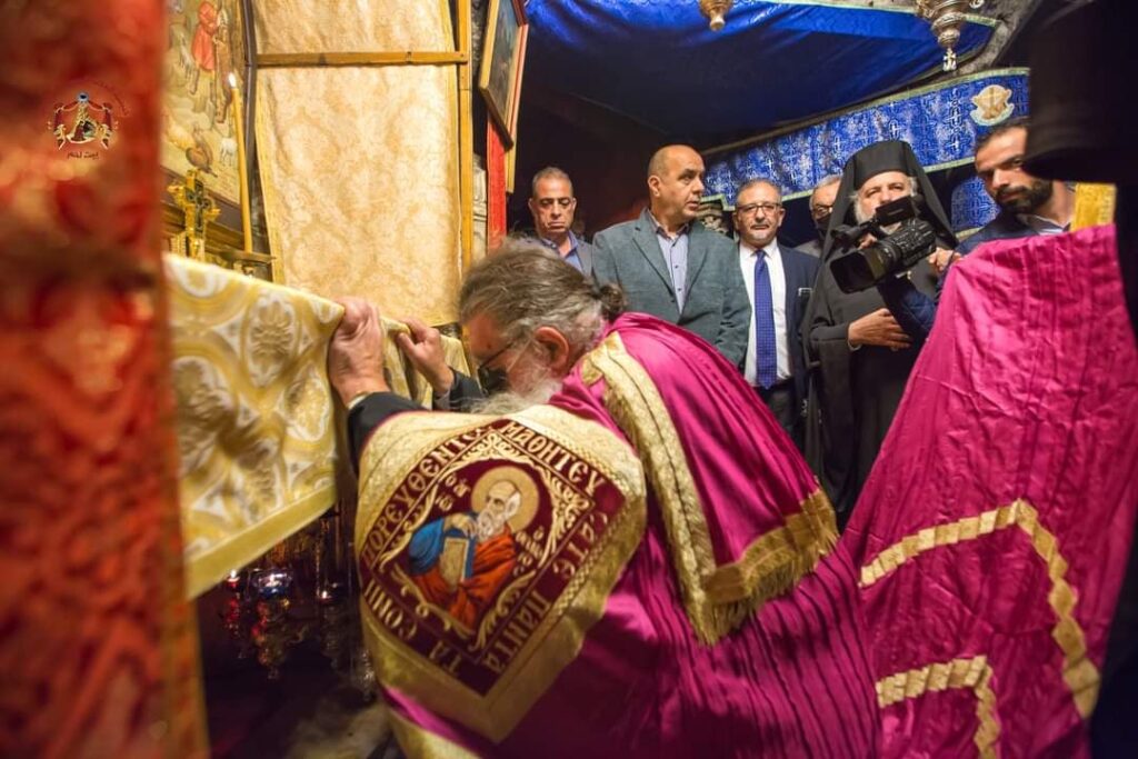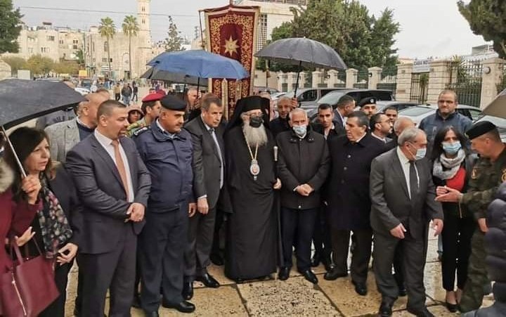 دَخلَ صَاحبُ السّيادةِ المُطران فينيذكتوسْ (يَتقدمُ مَوكِبَهُ قَوّاسَةُ بطريركيَّةِ الرُوم الأرثوذكس) كنيسةَ المَهد زائرًا مَوقِعَ مَغارةَ المِيلادِ يُرافقُهُ المتروبوليت إيسيخيوسْ والأرشمندريت ماتيوسْ (التُّرجُمان) والأرشمندريت إغناطيوسْ الرّئيس الرّوحيّ لمدينة بَيتْ جالا.