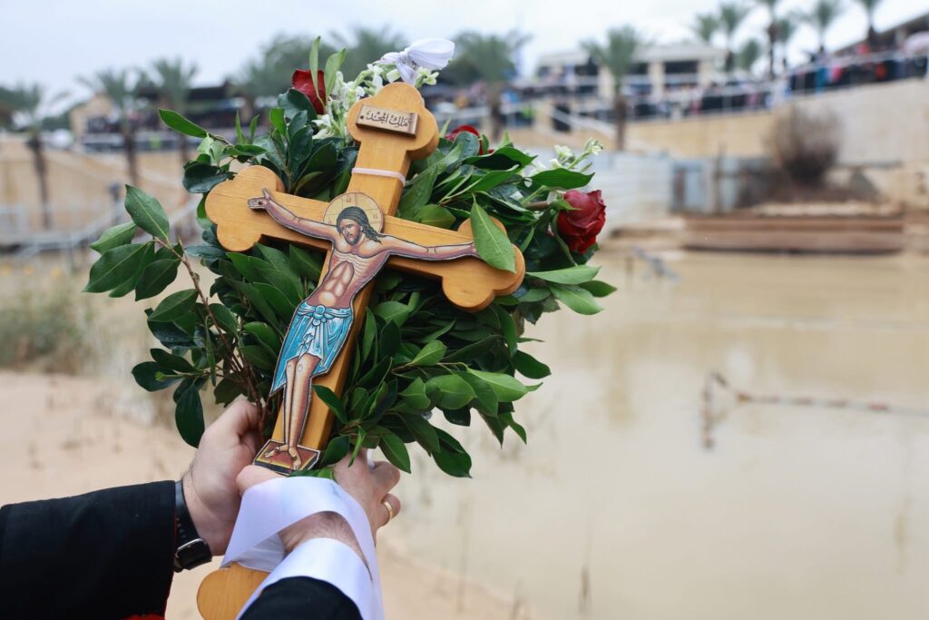 فمن الضفّة الغربيّة لنهر الأردن، ترأّس غبطةُ البطريرك كيريوس كيريوس ثيوفيلوس الثّالث بطريرك المدينة المقدّسة وسائر أعمال فلسطين والأردن خدمةَ التقديس، حيث ألقى غبطتُه الصليبَ في مياه النهر، محافظةً الكنيسةُ بذلك على تقليدٍ كنسيٍّ عريق، كان معمولًا به قديمًا حين كان منسوبُ مياه النهر مرتفعًا، في هذا الموقع المقدّس الذي شهد الظهور الإلهي.